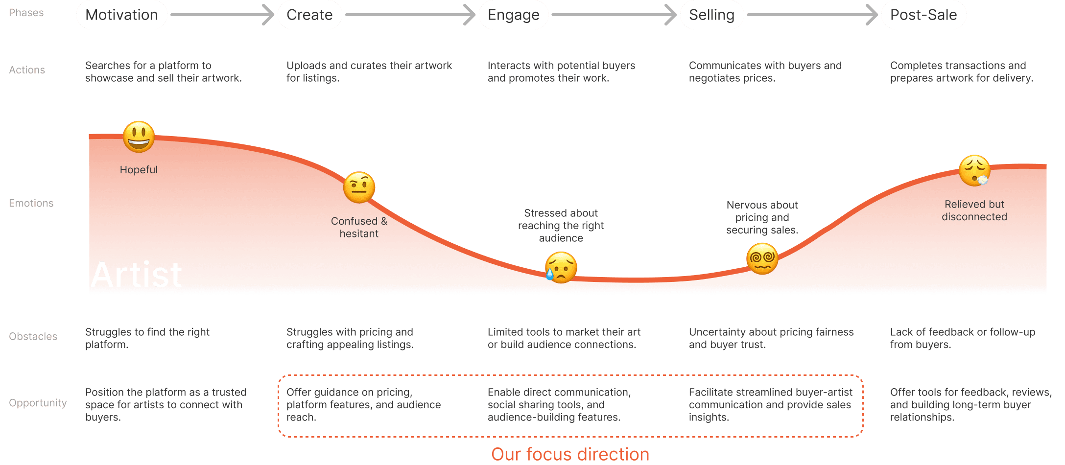To gain a comprehensive understanding of the art sales journey, we created personas for both the artist and the buyer. These personas guided our design process by highlighting their unique goals, pain points, and motivations.