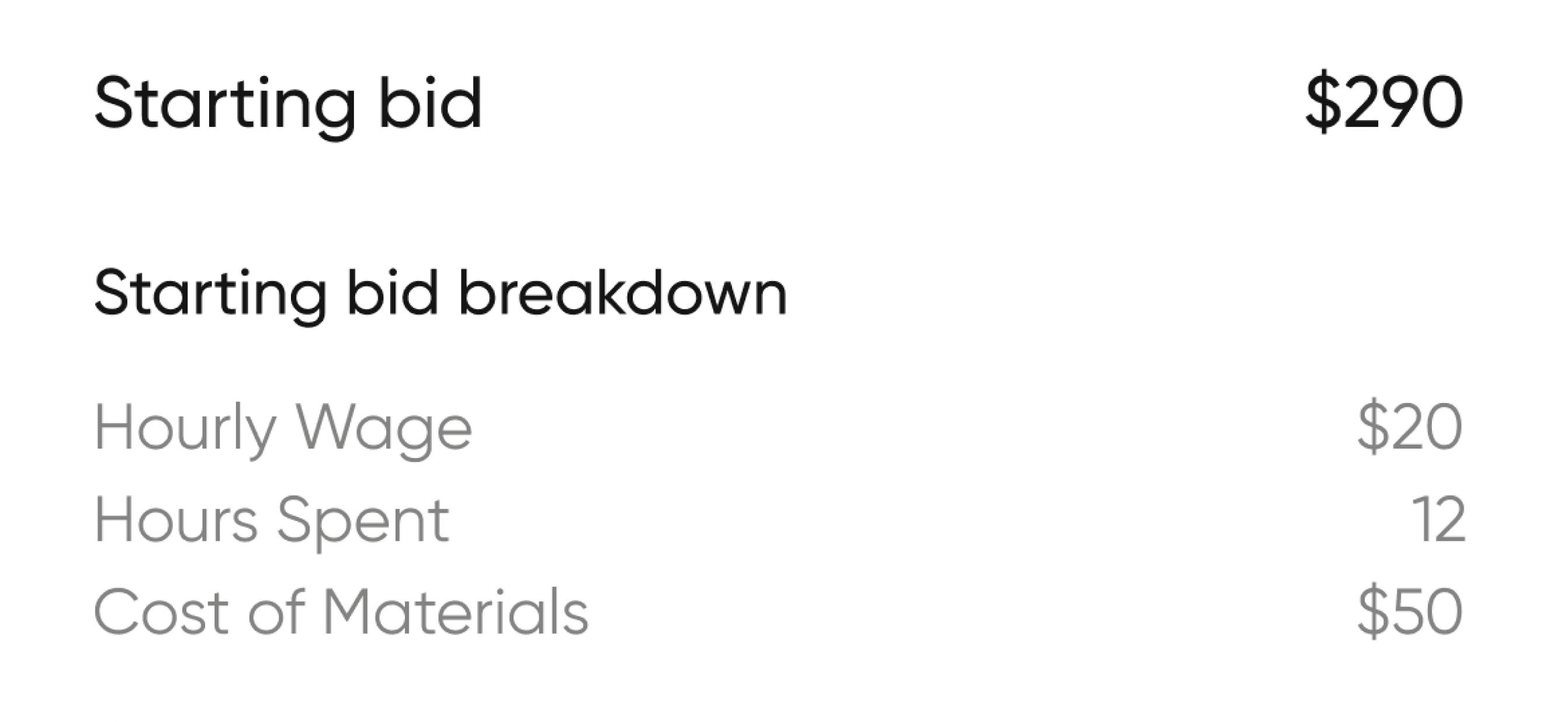 Our usability testing showed that "hours spent" was deemed untrustworthy by users because artists can technically input any number of hours they want. We proposed another version of the price breakdown, which will undergo further usability testing to validate our assumption.