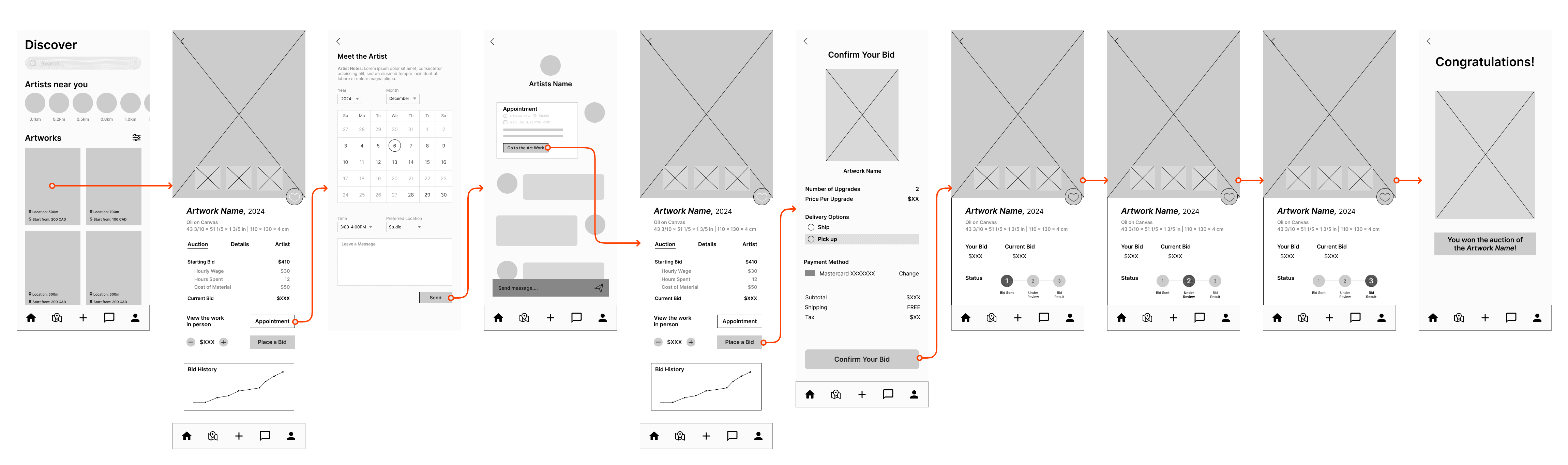 UX research, competitive analysis, user flow, artist & buyer wireframes, interactive prototypes, and usability testing.